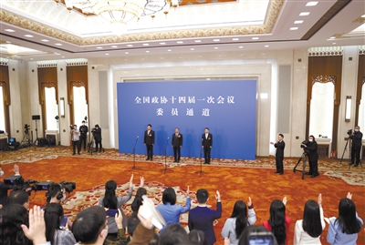 3月7日,全国政协十四届一次会议第二场“委员通道”集体采访活动在北京人民大会堂新闻发布厅举行。这是记者在现场举手提问。 新华社记者 曹灿 摄