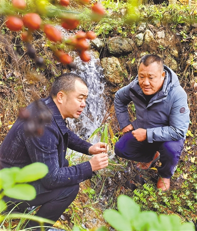 在铁长乡张地村的林下中草药种植基地,王书华正与公司负责人一同察看仿野生猴仙丹的生长情况。