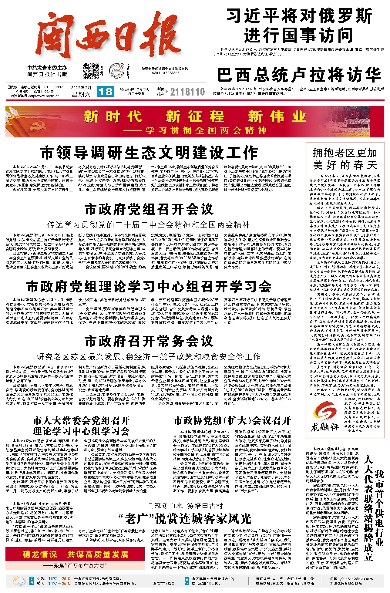 余红胜强调,要深入学习贯彻习近平生态文明思想,讲好习近平总书记在龙岩留下的“一棵香樟树”“一本林权证”等生动故事,践行绿水青山就是金山银山的理念,打好绿色生态牌,扎实开展生态环境综合整治专项行动,加快构建人与自然和谐共生的现代化。市生态环境局要持续深入打好蓝天、碧水、净土保卫战,确保生态环境质量保持全省领先;要坚持产业生态化、生态产业化,严把项目和企业环保关,推动发展方式绿色转型。市水利局要持续拓展提升水土流失治理“长汀经验”,加快推进万安溪引水工程项目建设,持续抓好中心城区水系综合治理,努力建设龙岩老百姓喜爱的美丽幸福河,打造“水美城市”。市林业局要拓展提升林改“武平经验”,围绕“两山”价值转化,谋划林业综合改革发展重点项目;要探索林业产业发展新模式,发展绿色富民产业;要全力推进龙岩世界地质公园创建,进一步提升城市知名度和影响力。