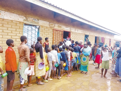 3月16日,在马拉维布兰太尔,一些灾民儿童在一所小学内的临时安置营地领取早餐。马拉维灾害事务管理局3月16日晚发布通报说,热带气旋“弗雷迪”引发的洪水、强风和泥石流等灾害已造成该国南部地区326人死亡、201人失踪、796人受伤,超过18万人流离失所。新华社发 约瑟夫 摄