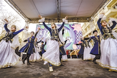 3月19日,人们在阿塞拜疆首都巴库举行庆祝活动,迎接即将到来的诺鲁孜节。 新华社发 巴巴耶夫 摄