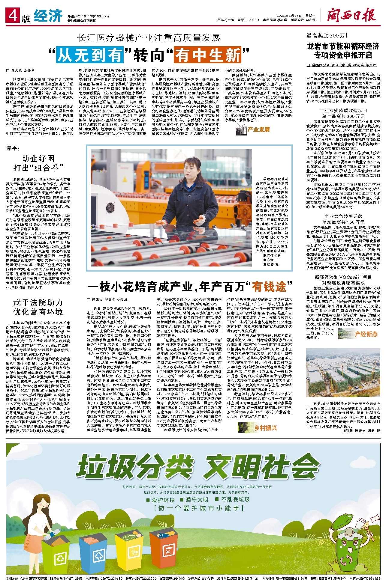 阳春三月,春和景明,在长汀县二期医疗器械产业园,福建省百仕韦医用高分子股份有限公司的厂房内,200余名工人正在忙碌生产宠物器械、留置针等产品,正在开展留置针包装自动化车间建设,预计今年底项目可全面竣工投产。