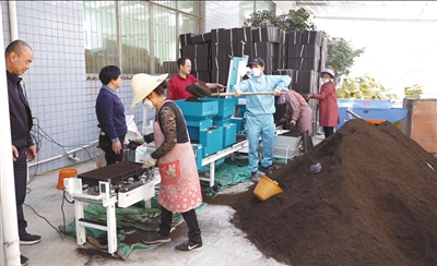 近日,在永定区初溪生态农业发展有限公司下洋集中工业区的育秧现场,一条水稻育秧生产线正开足马力生产。在工人们的配合下,经过摆盘、撒土、浇水、撒种、盖土、出盘6道程序后,一个个秧盘就制作完成了,整个流程不超过30秒。“这个自动化育秧机是今年新增的播种设备,以前都是用人工育秧,五六个工人要好几天才能完成稻谷的播种,而且效果也没那么好。”种粮大户陈安娣说。 通讯员 汤浩宇 摄