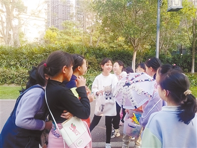 近日,三名女学生相约在中心城区莲东绿道公园,拿着精美的珍珠发夹、卡通皮筋和好玩的玩具,向过往的市民推销。图为一群外出的女生们,被这些可爱的发饰、玩具吸引,互相斗智斗勇地讨价还价,她们各自体验到实践活动的趣味。 融媒体记者 蓝芳 摄