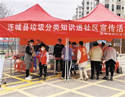 今年以来,连城县结合党员进社区持续开展垃圾分类进社区宣传活动,县城市管理局联合县直部门、莲峰镇,组织党员干部志愿者进小区、到公园、入商铺,通过入户宣传、摆摊设点、有奖竞答等形式,广泛宣传垃圾分类知识,积极营造自觉参与垃圾分类的浓厚氛围。图为近日,志愿者进社区宣传垃圾分类的情景。 通讯员 黄水林 李志能 摄