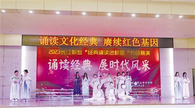 近日,长汀职专举行“诵读经典 展时代风采”2023经典诵读——中华优秀传统文化进校园系列活动,为师生们送上一道丰富多彩的传统文化大餐。图为活动现场。