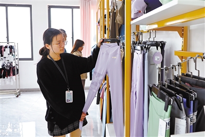 位于银雁新城的朗晴服装科技(龙岩)有限公司是一家集研发、生产、销售于一体的专业服装制衣公司,与新兴工业集团签署长期战略合作,生产瑜伽服、运动服、家居服、时装、无痕内衣等服饰,产品供应国内外市场。图为近日该公司销售人员在挑选电商产品。