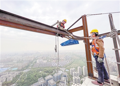 4月29日,工人在位于上海的中建三局一公司华东公司某建设工地施工。当日是“五一”假期的第一天,全国各地不少劳动者仍然坚守岗位,在劳动中过节。