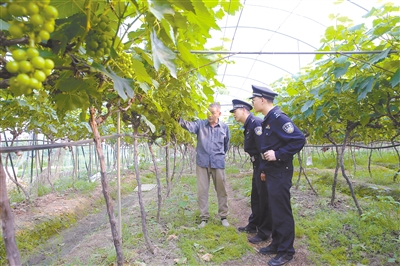 铁山派出所民警走进辖区葡萄种植户陈大哥的葡萄园内拉家常、话农事,关心其葡萄种植情况。