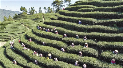 5月2日,晴空万里,青山翠绿,在连城县赖源乡黄宗村1350多米海拔的高山茶园现场,笔者看到来自厦门等地自驾车休闲生态游的客人,在茶园边观赏千亩梯田的茶山美景,边体验绿色茶芽的采摘乐趣,茶山上人潮涌动,泛着青嫩的茶芽令人陶醉。