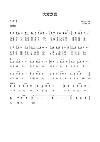 为助力“大爱龙岩”新时代精神文明品牌建设,去年底,市委宣传部联合市委文明办、市文联、市融媒体中心举办“大爱龙岩”主题歌曲征集评选活动。为进一步营造“大爱龙岩”浓厚氛围,共同传唱优秀歌曲,本报现对获第一名的《大爱龙岩》(作者:赵汀生 兰茂林)词曲予以刊发。