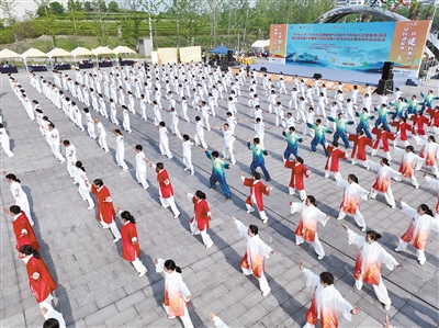 5月14日,在江苏省扬州市体育公园,健身爱好者在表演健身气功(无人机照片)。