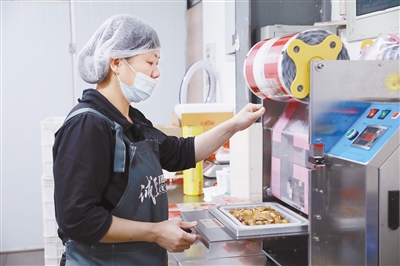 工作人员正在对预制菜进行包装塑封 蓝明丰 摄