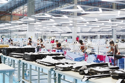 长汀安踏体育用品有限公司是安踏集团旗下的服装生产基地,专业生产体育运动系列服装产品。目前,公司共有40条服装生产线,二期智能吊挂车间于去年10月正式投入运营。图为智能化生产车间一角。
