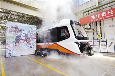 6月6日,中国中车出口阿根廷新能源轻轨车辆首列车在中车唐山公司下线,这也是我国新能源轻轨车辆首个出口项目。这款新能源轻轨车,具有可拓展多种动力模式、灵活可变编组等功能,将服务于阿根廷胡胡伊省。新华社记者 牟宇 摄