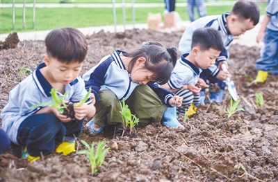 6月6日,孩子们在幼儿园的“农耕园”里跟着老师一起种玉米苗。当日是芒种节气,浙江省湖州市长兴县虹星桥镇中心幼儿园的老师带领孩子们通过播种幼苗、除草浇水以及绘画、手工制作等方式来了解节气,满足孩子的探究欲望,感受农耕文化,让孩子们更加懂得珍惜粮食。新华社记者 徐昱 摄