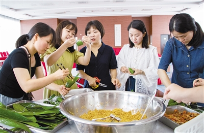 19日,市委党校开展“节日感党恩 共话新时代”端午节群众性宣传教育系列活动,教职工和古田镇五龙村干部群众一起,通过“讲”端午、“诵”端午、“做”端午等丰富多彩的活动,体验传统文化魅力。图为教职工围在一起,一边包粽子一边互相交流技巧和经验。 融媒体记者 曾萍 通讯员 刘泉斌 摄
