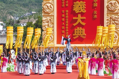 6月22日,演员在公祭伏羲大典上表演乐舞告祭仪式。当日,2023(癸卯)年公祭中华人文始祖伏羲大典在甘肃省天水市举行。 新华社记者 郎兵兵 摄