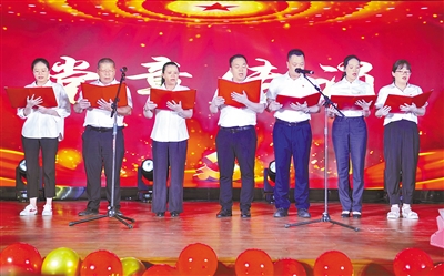 为全面推进社区党建品牌建设,树立基层党组织和党员的良好形象,6月30日,由中共高新区(经开区)企业委员会、新罗区东肖镇东华社区等5家单位联合主办的“党章传诵、党徽闪光、党旗飘扬”迎“七一”晚会在珠江大厦举办。图为晚会演出现场。 郑秋生 摄