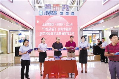 为提高金融消费者防范意识,全力构筑诈骗“防火墙”,守护人民群众“钱袋子”,当好群众金融安全的“守门员”,近日,农行龙岩高新区支行开展了形式多样的“守住钱袋子 护好幸福家”防范和处置非法集资宣传活动。
