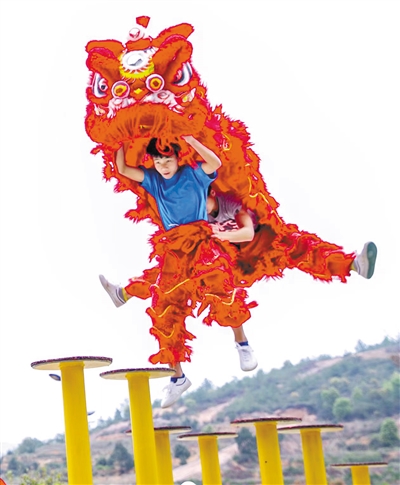 上杭县庐丰畲族乡充分发挥红色资源丰富和畲族文化底蕴深厚的两大优势,形成乡村旅游和畲族文化旅游两翼齐飞的格局。图为近日拍摄的舞狮表演。 通讯员 杨国鑫 摄