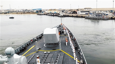 中国海军第43批护航编队18日结束对刚果(布)友好访问,于当地时间上午10时离开黑角港。这标志着中国海军第43批护航编队圆满完成西非5国访问任务。 新华社发 吴亢慈 摄