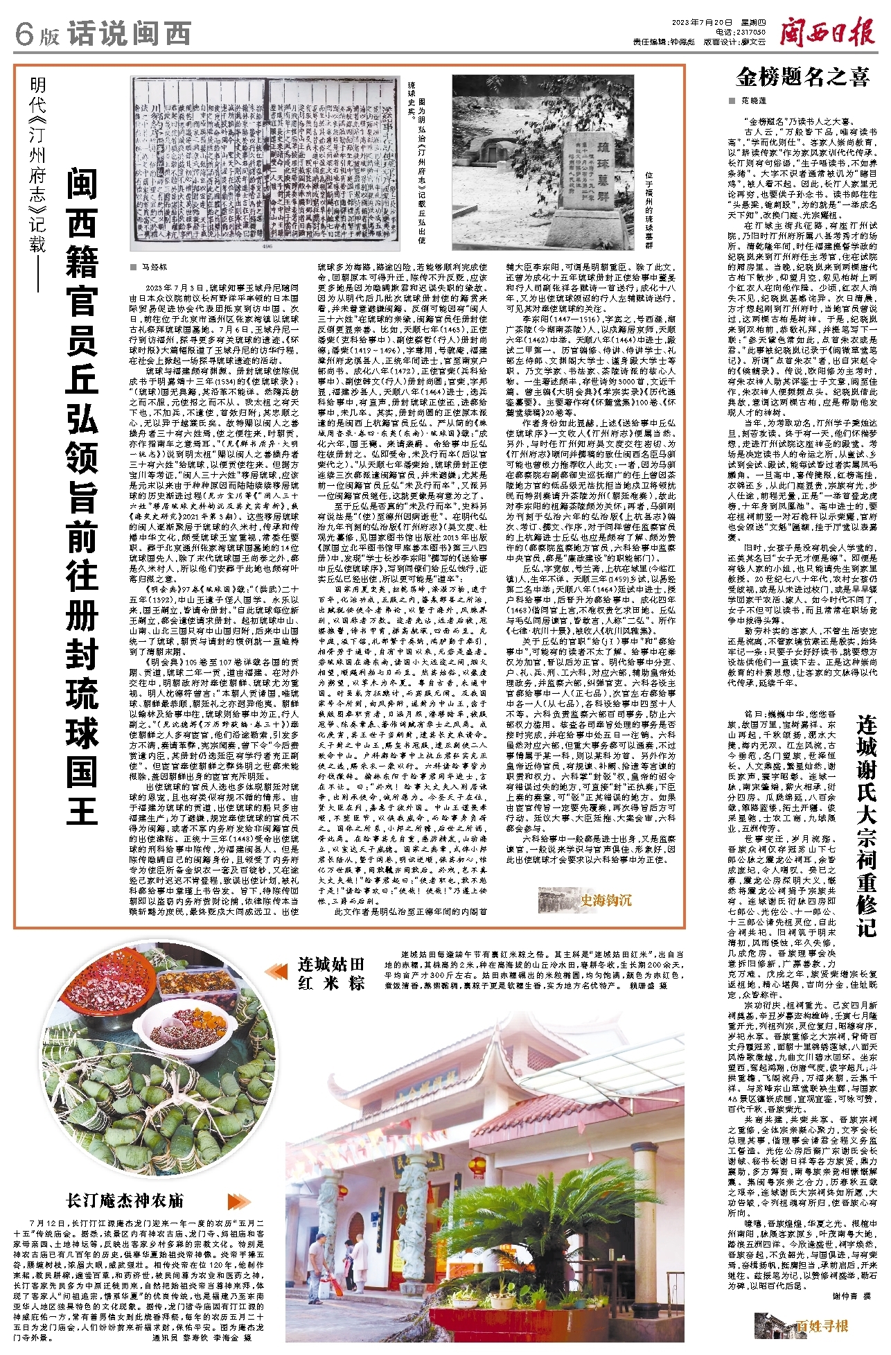 作者身份如此显赫,上述《送给事中丘弘使琉球序》一文收入《汀州府志》便属当然。另外,与时任汀州知府吴文度交往密切、为《汀州府志》顾问并撰稿的致仕闽西名臣马驯可能也曾极力推荐收入此文:一者,因为马驯在都察院右副都御史巡抚湖广的任上曾因茶陵地方官的低品级无法抗拒当地戍卫将领扰民而特别奏请升茶陵为州(朝廷准奏),故此对李东阳的祖籍茶陵颇为关怀;再者,马驯刚为刊刻于弘治六年的弘治版《上杭县志》编次、考订、撰文、作序,对于同样曾任监察官员的上杭籍进士丘弘也应是颇有了解、颇为赞许的(都察院监察地方官员,六科给事中监察中央官员,都是“廉政建设”的职能部门)。