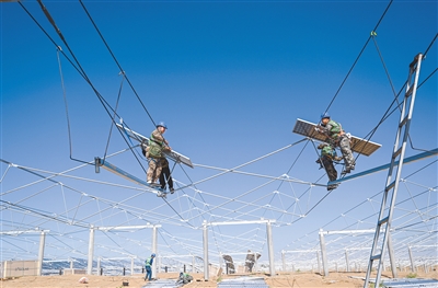 7月22日,工人在蒙西基地库布其200万千瓦光伏治沙项目里忙碌。近日,位于内蒙古杭锦旗库布其沙漠亿利生态示范区的蒙西基地库布其200万千瓦光伏治沙项目进入光伏板安装环节。该项目总投资111.5亿元,预计2024年底前实现全容量并网发电,建成后年平均可供应绿色电力约40亿千瓦时。 新华社记者 刘磊 摄