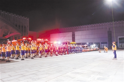 为应对台风“杜苏芮”来袭, 7月26日晚,龙岩市新罗区消防救援大队集结解放站、莲东站、北门站、东宝站及龙岩曙光救援民间救援力量,在龙岩会展中心组织开展夜间集结拉动演练,以确保发生险情时,能够 “拉得出、冲得上、打得赢”。 通讯员 叶玥辛 摄
