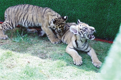 世界A级国家重点自然保护区梅花山被中外专家认定为“华南虎最理想的栖息地”,第13个世界老虎日来临之际,27日记者在上杭县梅花山虎园幼虎饲养区看到,2只2个月大的小华南虎摇着可爱的小尾巴,样貌呆萌,正在圈起的草地里快乐玩耍。游客们在工作人员的指导下与小老虎互动,近距离观察它们的可爱日常。 融媒体记者 游木昆 范璐巍 摄