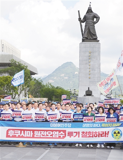 8月25日,在韩国首尔光化门广场,人们手持标语抗议日本核污染水排海。当日,韩国最大在野党共同民主党成员和众多市民聚集在首尔光化门广场,手举标语进行示威游行,抗议日本核污染水排海。日本政府24日启动福岛核污染水排海,这一决定遭到国际社会的批评和反对。 新华社记者 王益亮 摄