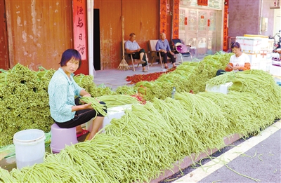 近日,长汀县馆前镇的1000余亩长豆角、茄子等蔬菜迎来收获季,村民们忙着采摘、搬运、装车,一派喜人的丰收景象。近年来,长汀县馆前镇积极调整农业产业结构,采取“合作社+农户+市场”的模式,结合市场需求种植特色蔬菜,带动当地农民增收致富。图为近日,馆前镇荣丰蔬菜合作社社员正在分拣长豆角出售。 通讯员 黎寿钦 李海金 摄