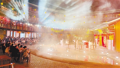 经过一个多月的剧本打磨、反复排演以及灯光舞美效果的升级,永定土楼《天涯共此楼》沉浸式演艺剧场恢复常态化演出,吸引了包括广东游客在内的众多省内外游客前来打卡观看。 通讯员 熊川 摄