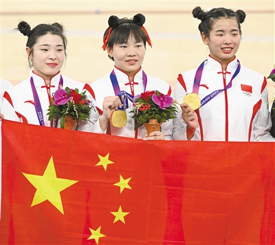 9月26日,冠军中国队选手鲍珊菊(中)、苑丽颖(右)和郭裕芳在颁奖仪式上。当日,杭州亚运会场地自行车女子团体竞速赛在浙江杭州淳安界首体育中心自行车馆举行,中国队以46秒376的成绩获得冠军并打破该项目亚洲纪录,韩国队和马来西亚队分获二、三名。 新华社记者 胡虎虎 摄