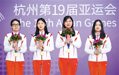 10月3日,杭州亚运会围棋女子团体金牌决赛在杭州棋院(智力大厦)棋类馆举行,中国队以2比0战胜韩国队,获得冠军。图为冠军中国队选手於之莹(左一)、吴依铭(左二)、李赫(左三)、汪雨博在颁奖仪式上。
