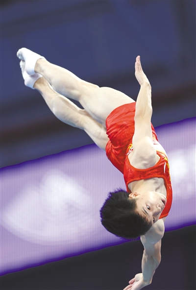 10月3日,在杭州亚运会蹦床项目男子决赛中,中国选手严浪宇获得冠军。图为严浪宇在比赛中。 新华社记者 程婷婷 摄