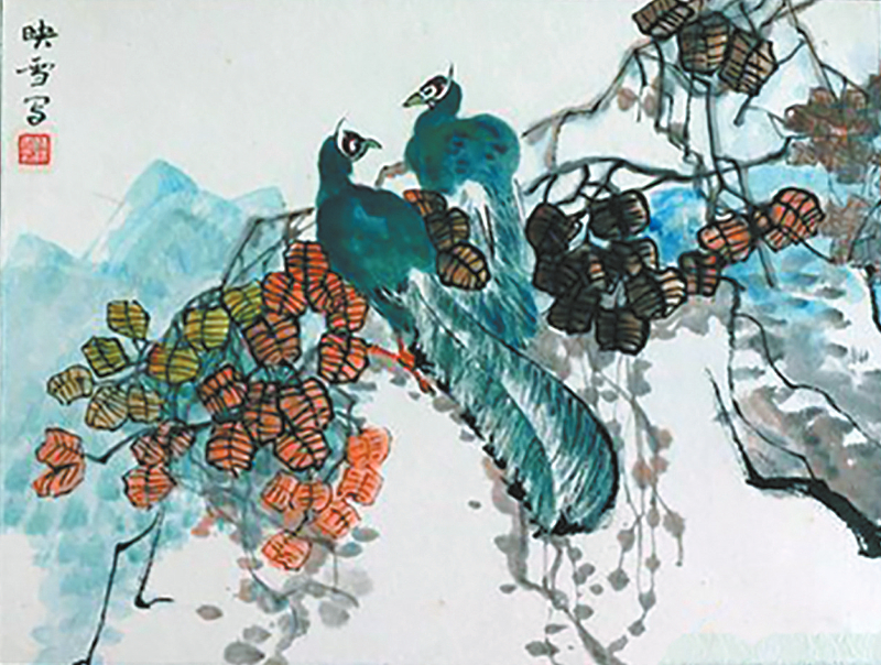 仔细鉴赏后测定,这幅连史纸花鸟画宽42cm、高32cm,左上角有行书“映雪写”三字,下有一款篆刻“林映雪”红色方印。
