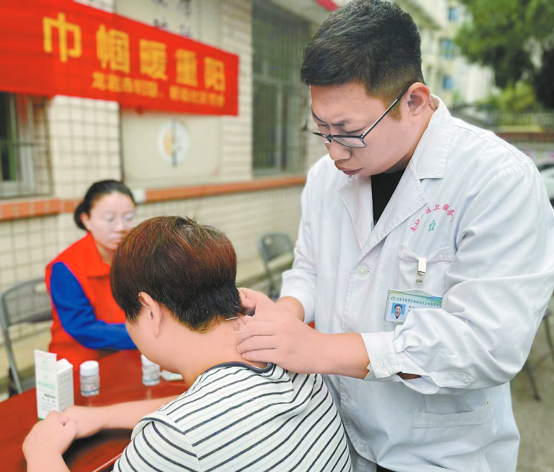 近日,新罗区南城街道新岩社区联合共建单位市妇联、南城卫生服务中心在麒麟生活小区开展“党建带妇建”活动,包括慰问活动、义诊、反诈宣传等。图为南城卫生服务中心的医生们提供针灸、拔罐等医疗服务。 融媒体记者 蓝芳