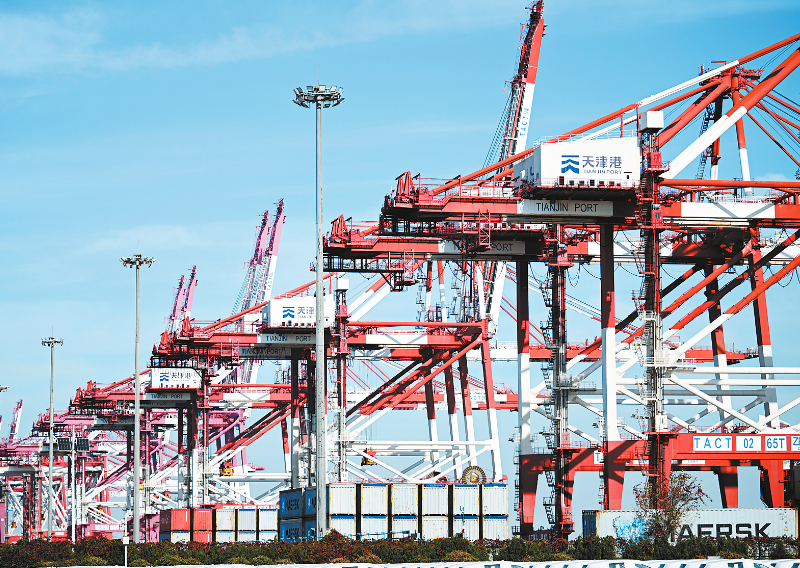 这是11月13日拍摄的天津港欧亚国际集装箱码头一景。近年来,天津港依托海陆运输节点的枢纽优势,积极打造“公转铁”“散改集”,发展水路、铁路、公路多式联运高效集疏运模式,推动港口集聚辐射能力不断提升。截至目前,天津港已开通40余条海铁联运通道、3条陆桥运输通道,天津港中蒙俄经济走廊集装箱多式联运项目入选国家多式联运示范工程。 新华社记者 赵子硕 摄
