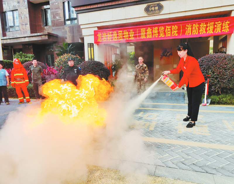 近日,新罗区中城街道双路亭社区联合好逸居物业在厦鑫博览佰院小区开展高层建筑消防安全演练,组织员工进行火灾现场疏散和灭火器使用的模拟演练,提高物业人员处理突发事件的能力。图为现场演练情景。融媒体记者 蓝芳 通讯员 冯建永 摄