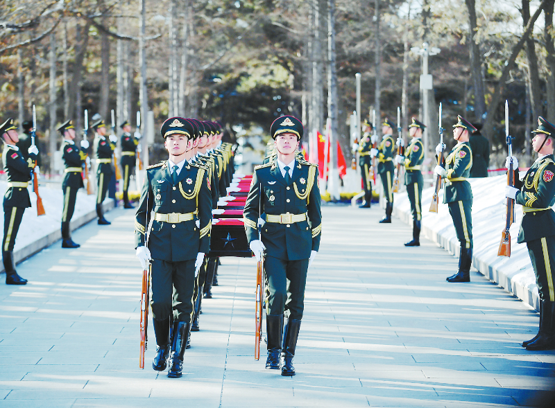 中国人民解放军仪仗司礼大队礼兵抬棺伫立,在甬道上等待进入陵园的下沉式志愿军烈士纪念广场。甬道一侧,已经安葬在这里的志愿军烈士墓冢新雪未消,披着素白。