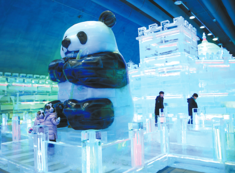 1月13日,在韩国江原道的华川山鳟鱼节现场,游客在哈尔滨工匠制作的大熊猫冰雕作品前留影。近日,韩国江原道华川郡举行山鳟鱼节,人们可在现场体验冰钓、滑冰、冰滑梯等丰富多彩的冰雪活动。主办方还邀请了来自哈尔滨的工匠为冰灯广场创作冰雕艺术品,吸引众多游客慕名而来。 新华社发 杨畅 摄