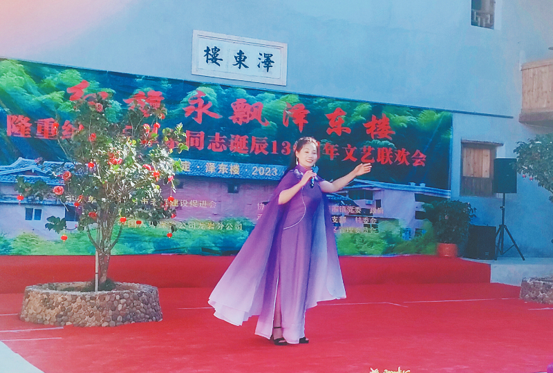 图为演唱者现场演唱《泽东楼上一盏灯》歌曲。