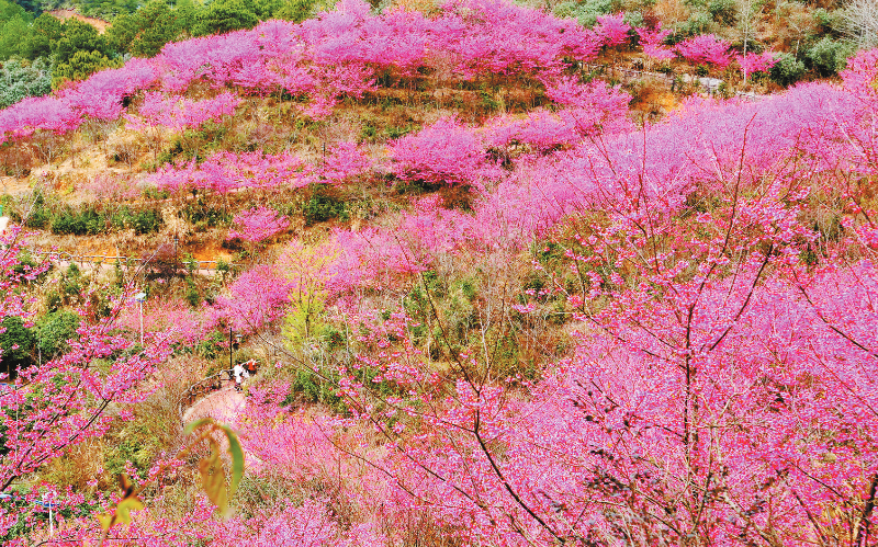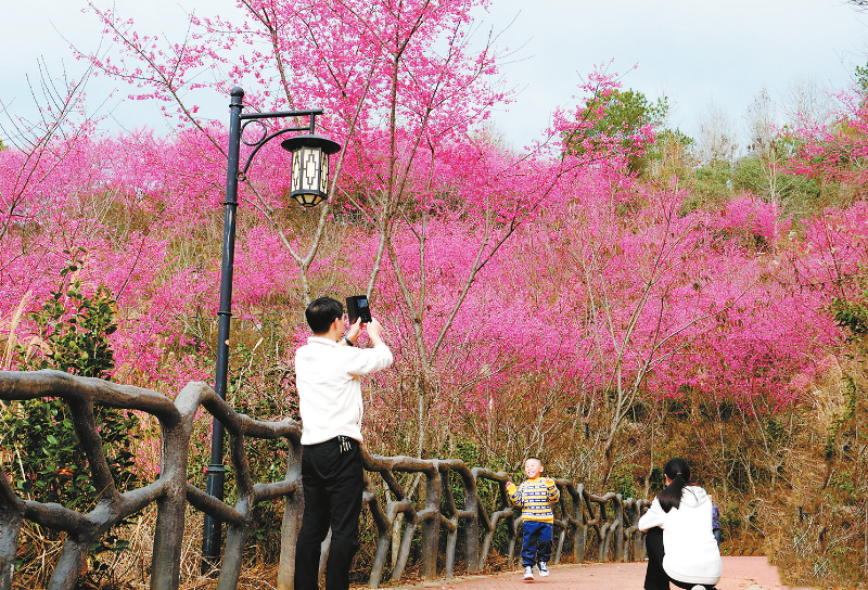 立春将至,暖湿清新,2月1日,笔者走进长汀红叶公园,只见漫山遍野一百多亩的山樱花绵延山头,一朵朵,一簇簇,粉的淡雅,红的娇艳,把山头装扮得更加妖娆。微风袭来,传来阵阵清香,沁人心脾。樱花林中,游人穿梭,有的和家人一起尽享“山花盛宴”,有的邀约好友,大家玩耍、拍照,兴奋地感受清新美景。红叶公园樱花林内的樱花已经全部进入盛花期,各色花朵缀满枝头,处处山樱花压枝,辛勤的小蜜蜂穿梭于一串串花朵之间,如梦如幻,游人与景相融,汇成一幅绚丽多彩的写意画卷。