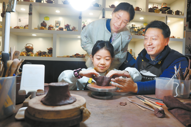 2月16日,游客在江苏宜兴蜀山老街的一家DIY紫砂陶艺体验馆制作紫砂小雕