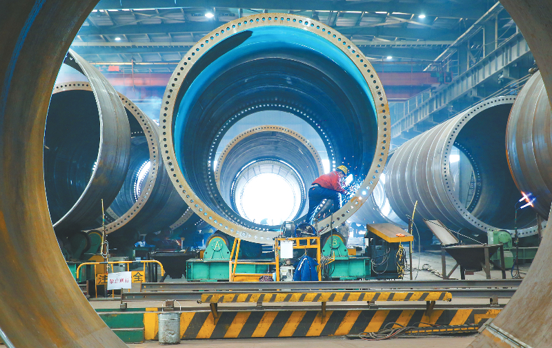 2月18日,江苏连云港经济技术开发区一家风电设备公司车间内,工人在生产风电塔架。2月18日是春节假期后第一个工作日,各地企业纷纷开工生产,生产一线一派热火朝天的繁忙景象。 新华社发 王健民 摄