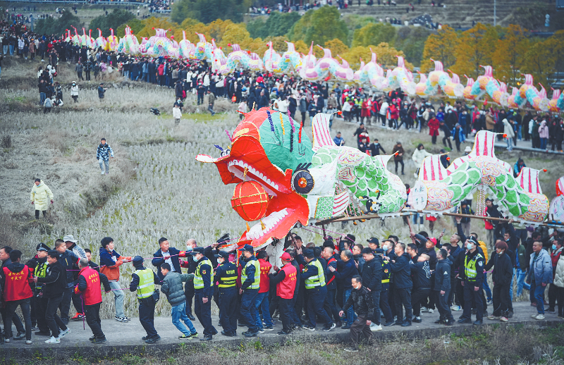 正月十五闹元宵,在中国传统村落集中连片保护利用示范片区、福建省历史文化名镇连城县姑田镇,“天下第一龙”姑田大龙翔游,看客云集。游龙现场锣鼓喧天,数千名当地中青年壮汉抬着118节、500余米长的“巨龙”,在长长的彩旗队、灯箱队的引领下,蜿蜒于乡间村野,穿行于大街小巷,腾挪起伏,活灵活现。