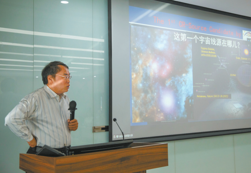 “拉索”首席科学家曹臻院士在中国科学院高能物理研究所介绍研究成果(2月22日摄)。科学家利用我国高海拔宇宙线观测站“拉索”(LHAASO),在天鹅座恒星形成区发现了一个巨型超高能伽马射线泡状结构,并从中找到了能量高于1亿亿电子伏宇宙线起源的候选天体。这是迄今人类能够确认的第一个超级宇宙线源。 新华社记者 金立旺 摄