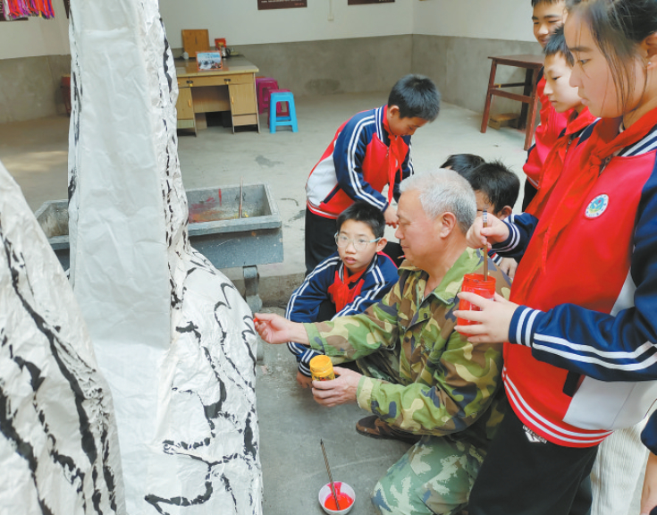 在姑田镇大龙展陈馆,小朋友们在制龙传承人的指导下体验龙身绘制。
