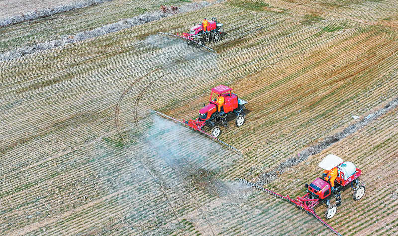 3月6日,在山东省荣成市虎山镇西双庙村,农机手驾驶自走式喷杆喷雾机进行小麦病虫害防治作业(无人机照片)。时下正值春耕备耕时节,各地抢抓农时,积极开展早稻育秧、农田翻耕、农机检修等工作,为春耕生产打下基础。新华社发 李信君 摄
